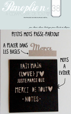 Le numéro 38 "A composer de tout coeur" n'est composé que de petits mots ultra passe-partout, à évider et à placer dans les bases (mais pas que.... la DT a mille et une idées -à suivre- pour utiliser ces matrices! Marque-page, tags, invitations etc.... )